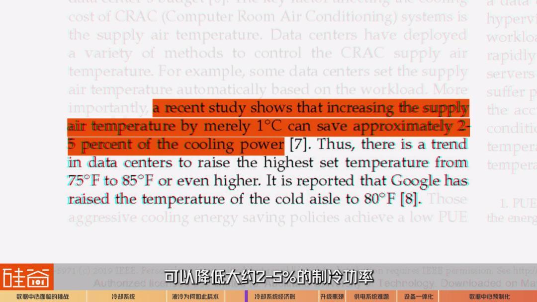 有论文研究称,数据中心每将送风温度提高1°C,可以降低大约2-5%的制冷功率,因此数据中心开始呈现把冷却系统温度从75℉(约23.9℃)提高到85℉(约29.4℃)的趋势,连谷歌也采取了这样的做法。