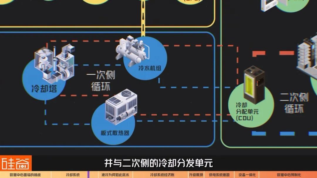 冷却系统会分为一次侧和二次侧,一次侧是将整体热量散走,并与二次侧的冷却分发单元(Cooling Distribution Units,简称CDU)来交换热量。