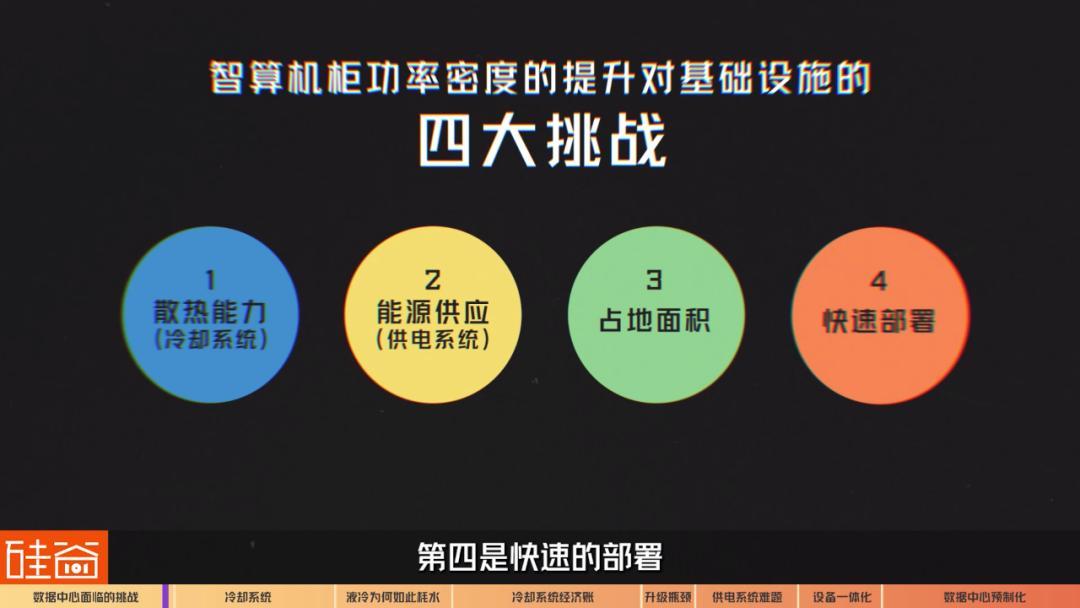 首先是给散热能力带来的挑战,第二个方面是给高效的能源供应带来的挑战,第三个是占地面积,第四是快速的部署。