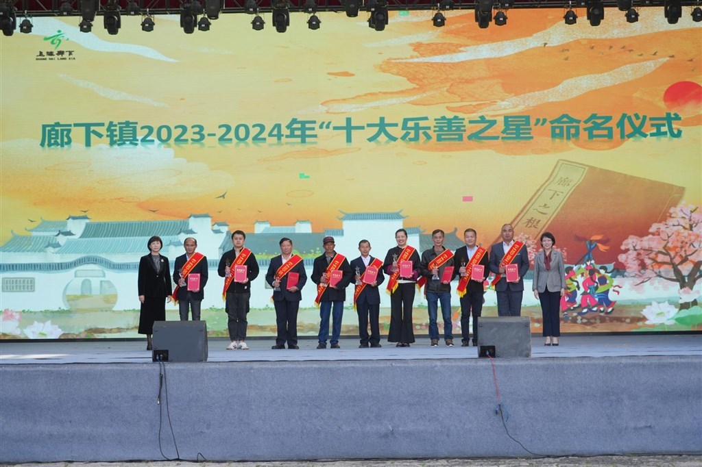 据介绍,该剧是以廊下南陆陆氏、邵氏、姚氏的真实人物和事件为原型,生动讲述了在历史文化的滋养下,廊下新农村呈现出的欣欣向荣、蓬勃发展之变化。同时,该剧充分挖掘并整合廊下乡土文化资源,将自然生态、民俗文化、农耕文化等元素巧妙有机融入,凭借生动的表演和深刻的内涵,让观众深切感受到兴文重教、好善乐施、耕读有道的精神力量。同时,该剧也完美诠释了 “乐善廊下” 的品牌内涵,为金山这座 “好人之城” 增添了崭新的光彩。仪式环节,廊下镇2023-2024年度“十大乐善之星”正式命名,下阶段,将通过多种形式开展好人事迹宣传,让乐善文化、厚德精神时时温暖着廊下大地。