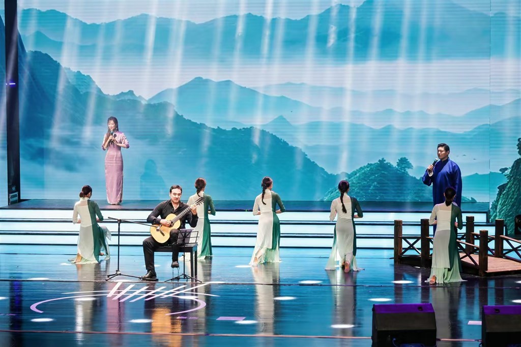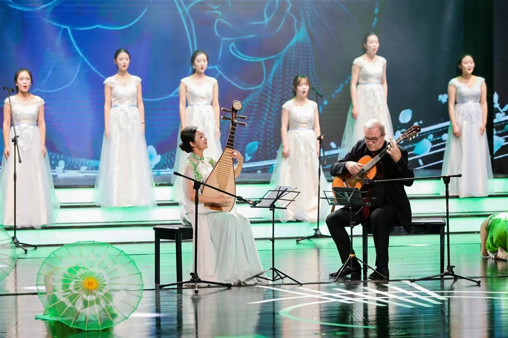 今年恰逢中法建交60周年,上海民族乐团著名琵琶演奏家李胜男与来自法国的吉他演奏家埃瑞克·佛朗塞利的跨界合作十分引人瞩目。两人合奏了巴黎奥运会开幕式上出现的《爱的颂歌》,向世界传递了爱的温暖与力量;又与华东师范大学华韵合唱团共同合作演绎中国经典名曲《茉莉花》。吉他与琵琶彼此呼应,既展现了东西方两种古老弦乐的精妙融合,更寓意了中法两国艺术家之间的深厚友谊。