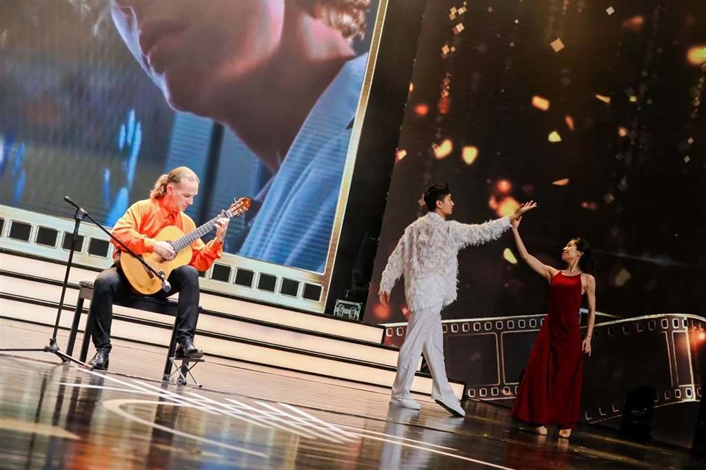 随后,奥地利的吉他演奏家、被誉为“吉他之王”的玛尔科·塔玛约深情演绎古典吉他独奏《月亮代表我的心》,以表达他对中国、对上海的喜爱。这首在座所有人都耳熟能详的歌曲在外国演奏家的指间流淌,旋律如声声独白,款款地走进了听众的心房,令人倍感亲切,同时也不禁感慨:艺术无国界。此外,玛尔科·塔玛约还演奏了电影《天使之城》的插曲《Angel》,搭配两位舞蹈演员的优美舞姿,现场演绎了动人的爱情故事。