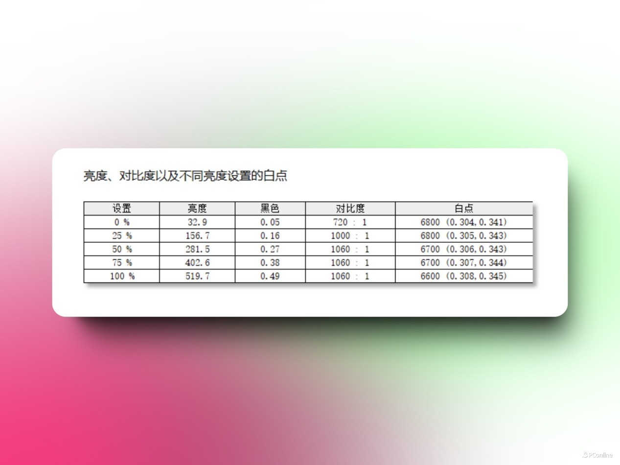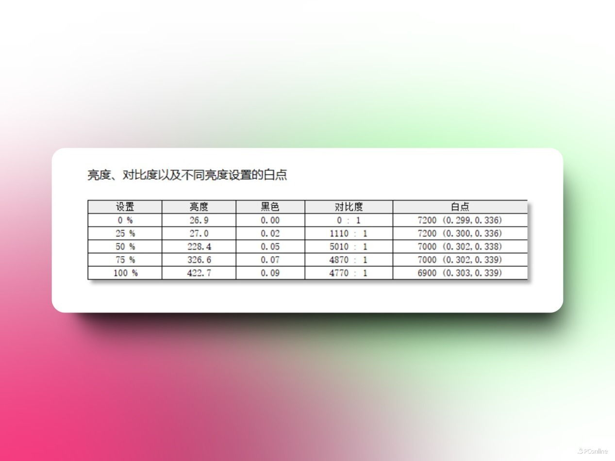 而在开启分区背光状态下,最高亮度略微下降至全局 422.7 尼特,但此时的对比度却提升至 4770:1。考虑到在 Spyder 校色仪测试过程中采用的是棋盘形式的黑白界面,可能会受到背光分区的影响,实际对比度可能更高,接近无限对比度。在实际观感中,分区背光的开启使得画面对比更为鲜明,暗部细节更为丰富。