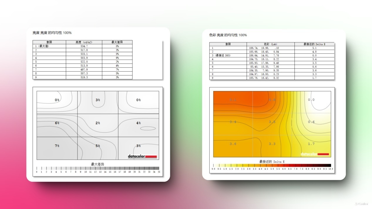 在屏幕均匀性测试中,我们发现当亮度设置为 100% 时,屏幕的最大色彩偏差值为 Delta E 5.1,出现在左上角区域。同时,最大亮度均匀性差值为 7%,位于左下角区域。整体表现尚可,对于一款采用 Mini LED 背光的显示器来说,这一结果在可接受范围内,且日常使用中难以察觉。