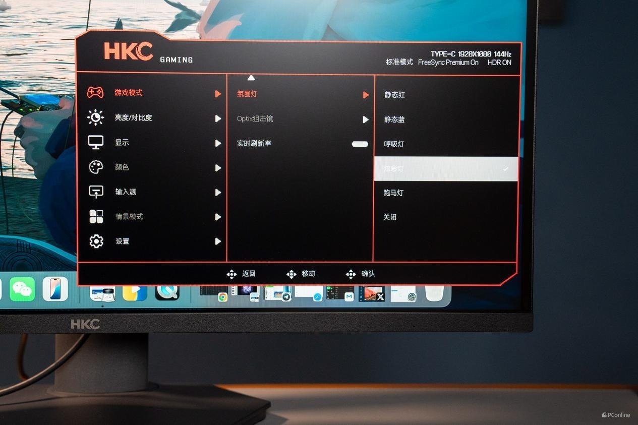 对于 HKC G27M7 Pro 的 HDR 效果,我们抱有很高的期待。在测试中,我们通过 Type-C 接口将显示器直连 MacBook Air(在 HDR 映射方面,macOS 系统具有独特的优势),并在系统中开启高动态范围显示。此时,显示器会自动切换到 HDR 模式,并激活高强度的分区背光。