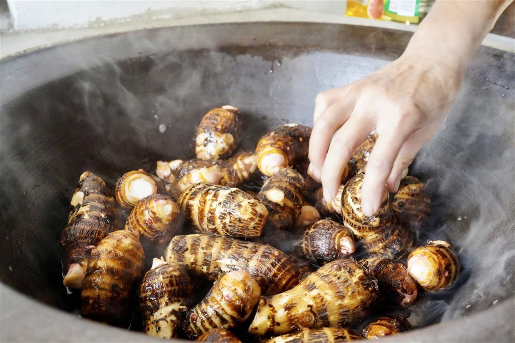“老人们都说芋头是个好东西。小时候,为了让我多吃几个,外婆在土灶上煮好以后,还会帮我准备白糖蘸来吃。”经过土灶蒸煮的芋头软糯清香,罗泾本地习惯蘸上白糖共同食用,这样一来,白砂糖的颗粒感会进一步丰富芋头的口感和风味。“芋头蘸白糖”承载着乡土的记忆,也是每个罗泾小孩“家的味道”。小周一边回忆,一边准备着另一道芋艿美食。