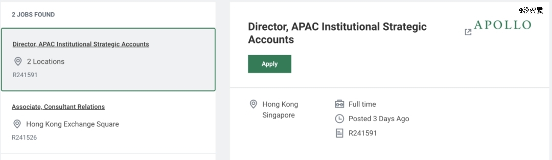 据官网介绍,阿波罗在北美、欧洲和亚太地区设有多个办事处,业务遍布全球 30 多个城市。其中,阿波罗在香港的办公室就位于中环康乐广场,共有四名团队成员。目前,香港团队正在招聘亚太区机构战略客户总监、顾问关系助理职位。