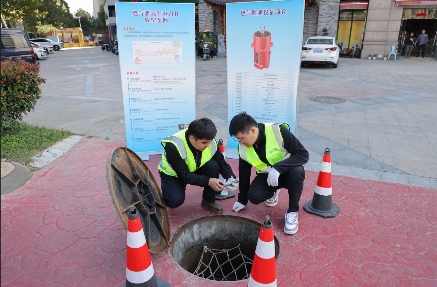 侯龙飞指着井下一台红色的圆柱体设备说:“我们正在检查的是清华合肥院自主研发的燃气检测设备,该设备可以对可燃气体浓度灵敏识别,根据窨井类型,周边管线情况,智能判断报警类别。”