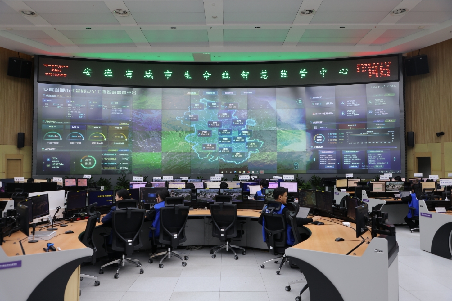 在清华合肥院合肥市城市生命线工程安全运行监测中心,大屏幕上,各种图表、数据实时更新,今日预警情况、各类管线风险评估、监测设备分布等信息一目了然。