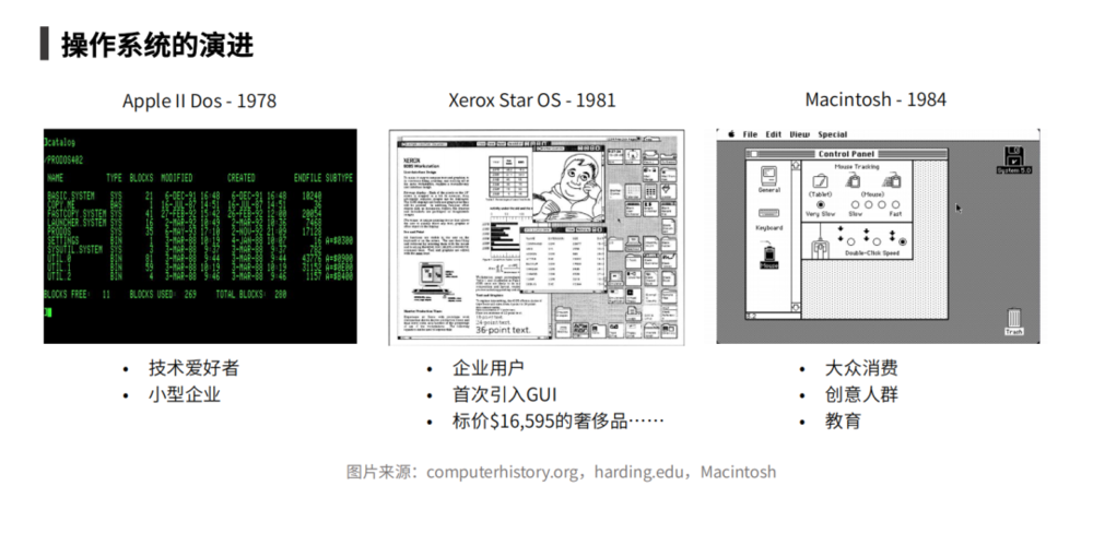 1984年,苹果推出的GUI进一步将使用场景扩展到创意、教育等细分领域,让操作系统进一步向大众普及。