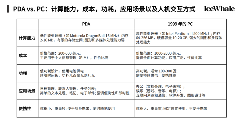 摩托罗拉于1999年发布的PDA也是如此。虽然它使用相对滞后的低算力硬件,但却满足了个人数字助理的需求。当时的PDA只是一个低成本的信息管理工具,可以记录日程和联系人,价格比PC低很多。PDA在便携设备的发展历程中曾占据了一个独特的小生态位,没有被PC吞并,并且可被视为手机的前身。