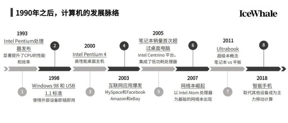 我们简单带过1990年后的故事。1990年代,我们迎来了英特尔奔腾处理器的发布、互联网应用的爆发、Windows 98的诞生、计算机外部设备连接标准USB 1.1,以及笔记本电脑的小型化与轻薄化,也就是我们常说的上网本和超极本。这一系列技术革新,指向了计算机发展脉络的不变趋势 —— 互联网真正走进了千家万户。