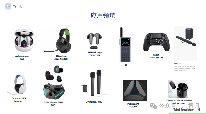 作为国产无线音频SoC市场的后来者,泰凌微电子一直深耕于无线物联网系统级芯片研发,2024年预计将出货超过20亿颗无线物联网芯片,有望成为全球第三大BLE芯片供应商。凭借多年来在无线SoC研发上的积累,泰凌微电子在2020年就推出TLSR951x系列蓝牙音频SoC,并成功获得了JBL、Sony和小米等知名品牌广泛采用,涵盖了多个热门产品线。
