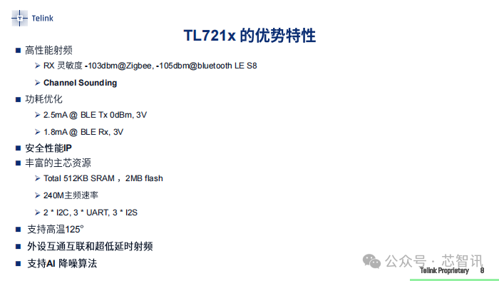 TL721x系列还是国内首颗工作电流低至1mA量级的超低功耗多协议物联网无线SoC芯片,在BLE Rx,3V场景下,工作电力仅1.8mA。同时,TL721x还内置安全性能IP,支持125℃高温环境下工作,支持外设互通互联、超低延时射频以及AI降噪算法。