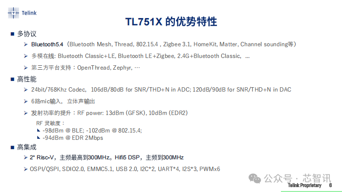 据介绍,TL751x系列芯片支持蓝牙5.4技术,并支持蓝牙Mesh、Thread、 802.15.4 、Zigbee 3.1、HomeKit、Matter、Channel sounding等协议,支持蓝牙 Classic+LE、蓝牙LE+Zigbee、 2.4G+Bluetooth Classic等多模在线。