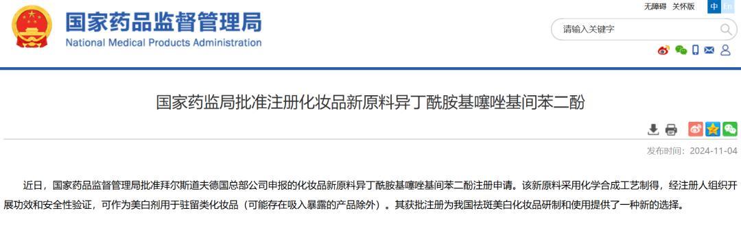 在进博会正式开展的前一天(11月4日),拜尔斯道夫德国总部公司申报的化妆品新原料异丁酰胺基噻唑基间苯二酚(肽安密多630),获得国家药品监督管理局批准注册。