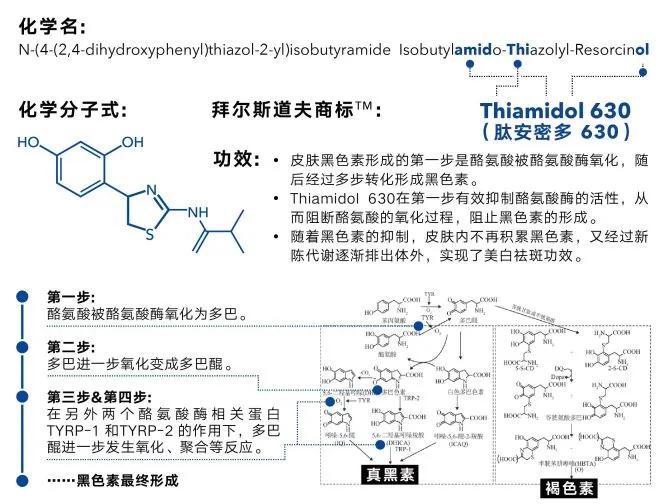 据集团介绍,肽安密多630是从50000种活性成分中筛选而来,其作用原理是通过在源头抑制酪氨酸酶活性,阻断酪氨酸后续的氧化过程,阻止黑色素的形成。而随着黑色素产生被抑制,皮肤内不再积累黑色素,再经过新陈代谢逐渐排出体外,从而根源实现了美白祛斑功效。