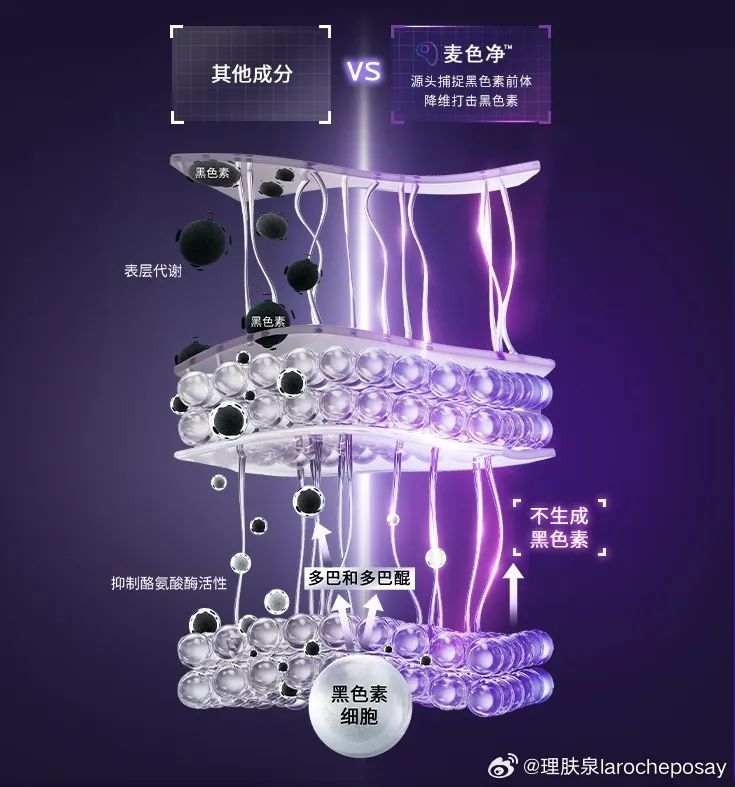 目前该专利成分已被应用于理肤泉全新“紫秒精华”,由理肤泉皮肤学实验室与皮肤学专家针对皮肤色素沉着问题共同研发,以麦色净为核心,并复配10%烟酰胺和理肤泉温泉水、烟酰胺、肌肽等10种活性成分,可以全面狙击黑色素。