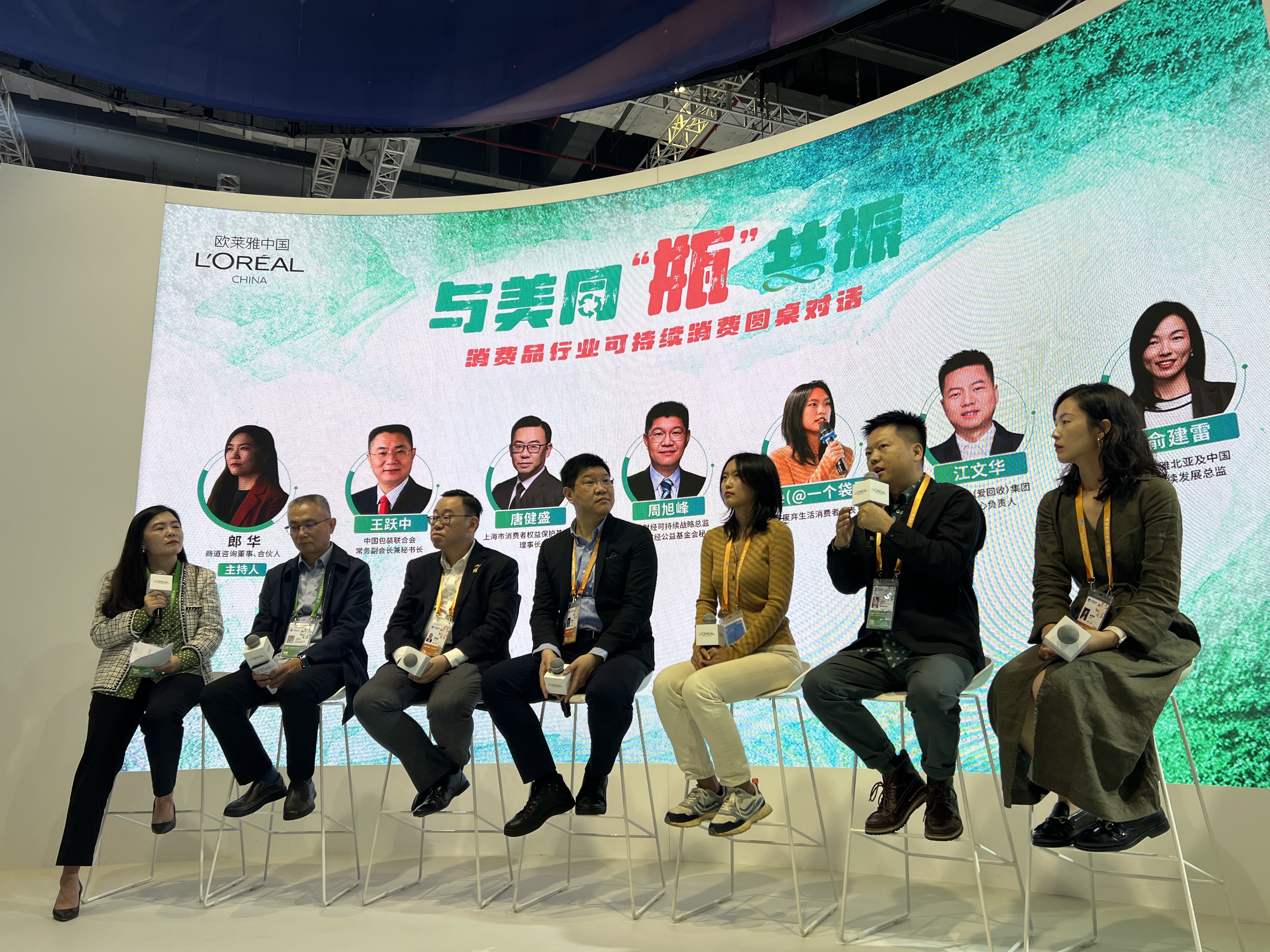 11月9日,在进博会主展台,欧莱雅还举办了聚焦消费品行业可持续消费的圆桌对话。欧莱雅北亚及中国公共事务总裁兰珍珍作主旨发言,包括万物新生集团品牌中心负责人江文华在内的八位行业领袖、知名学者等围绕可持续消费、循环经济等议题展开了探讨。嘉宾特别就消费者对品牌的期待和需求,以及“美妆行业空瓶回收新模式”等问题深入交流,以破圈合作推动行业绿色转型。