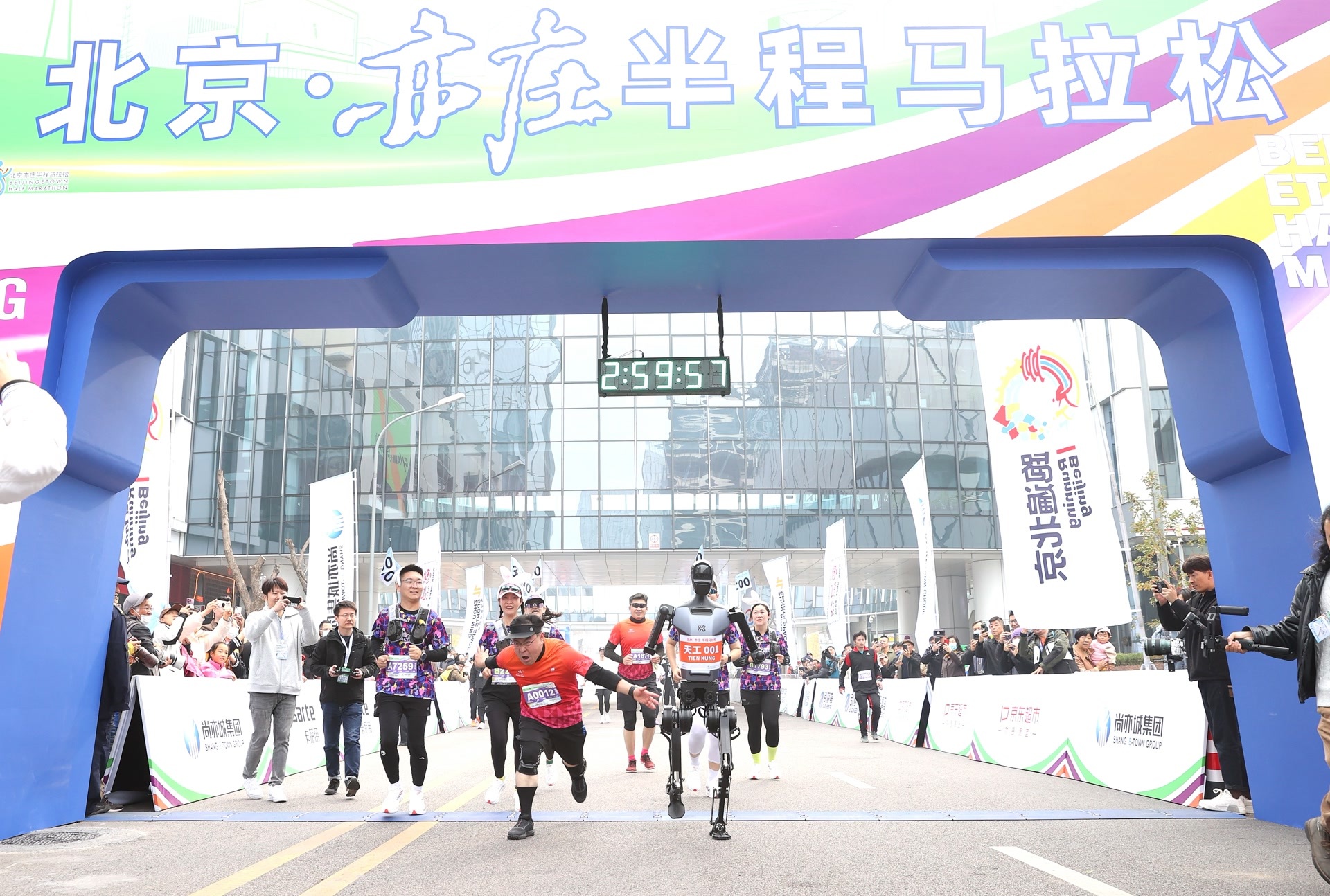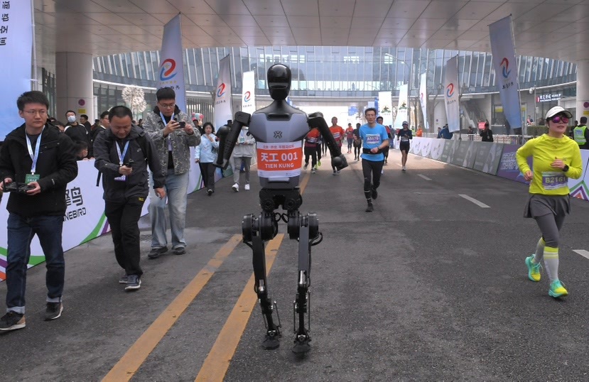 在今天上午的北京亦庄半程马拉松上,北京人形机器人“天工”进入赛场,与选手们一起冲过终点线。