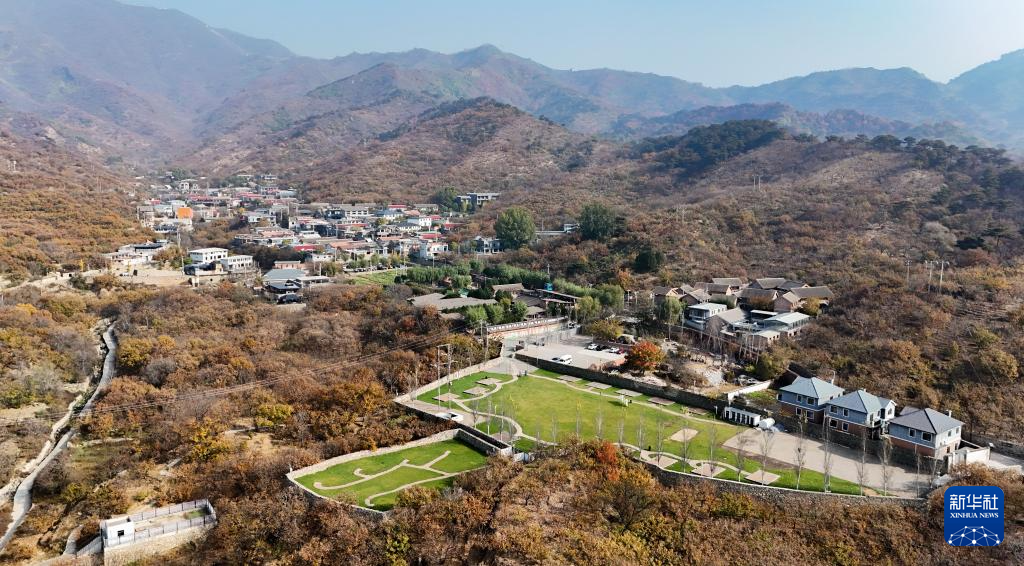 位于北京市怀柔区的慕田峪长城,从长城上可以俯瞰渤海镇北沟村(11月4日摄,无人机照片)。