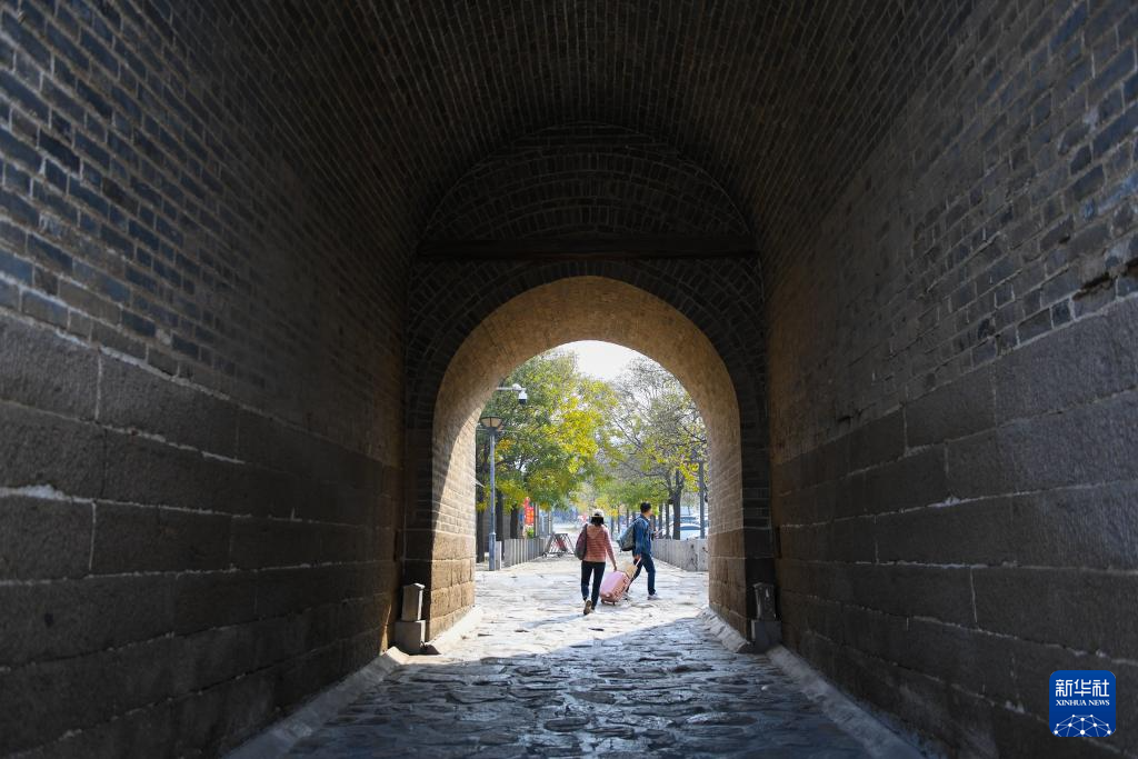 游客经过岔道古城的城门(11月1日摄)。