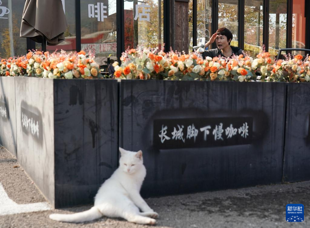 在北京市怀柔区慕田峪长城脚下的渤海镇北沟村咖啡厅前,一名工作人员在直播,向网友推荐北沟村(10月29日摄)。