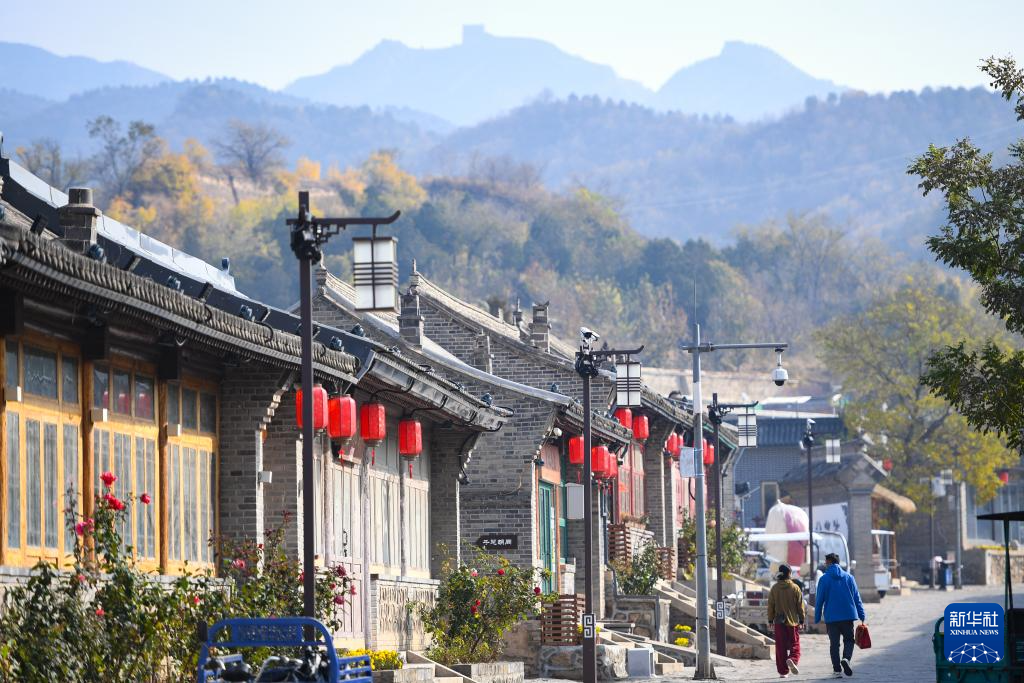 位于北京市延庆区八达岭镇岔道古城的建筑与远山上的八达岭长城交相辉映(11月1日摄)。