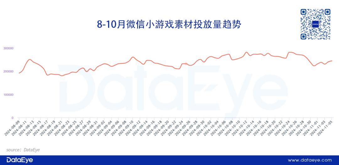 素材量方面,DataEye-ADX投放数据显示,10月微信小游戏投放量(图片+视频)日均为26.31万,环比9月提升约13%。国庆档投放量飙升,随后小游戏营销市场仍保持持续抢量状态,10月下旬出现素材投放量一波飙升。