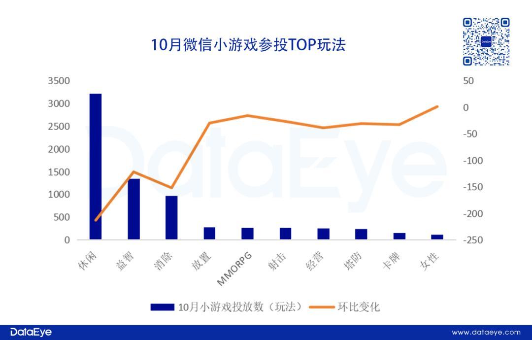 DataEye-ADX数据显示,10月参投微信小游戏玩法TOP10分类,休闲、益智、消除占比位列前3,但这3个玩法投放游戏数环比下滑明显,休闲玩法下滑超过200款,消除题材下滑超过150款,侧面反映出轻度休闲玩法不断大浪淘沙,缺乏美术、游戏性的产品陆续被淘汰。