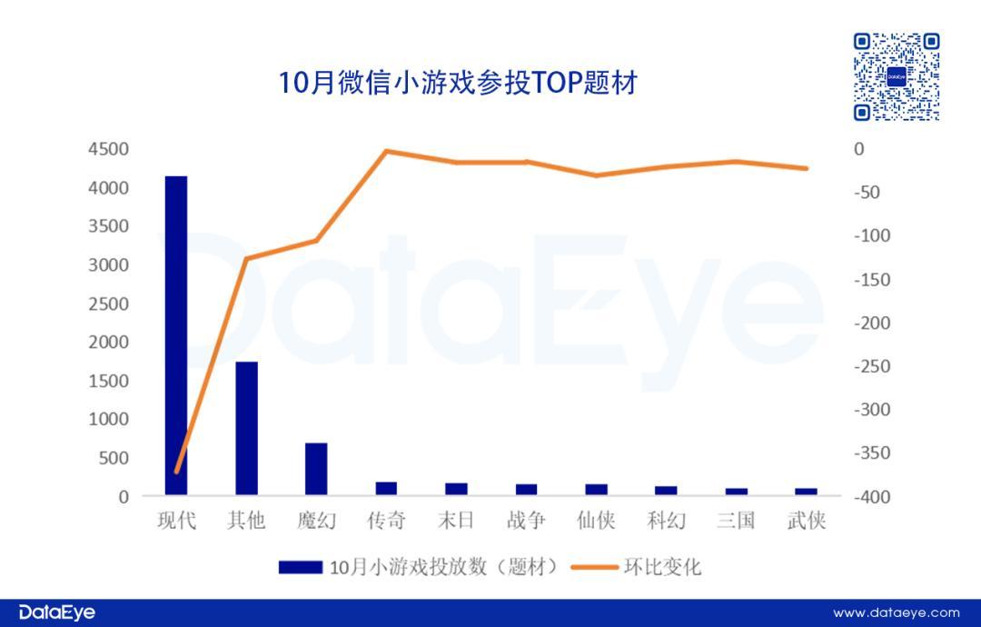 参投微信小游戏题材TOP10分类中,现代题材占比最高,其他题材排名第二,魔幻题材排名第三。同样,头部题材参投游戏数环比下滑明显。