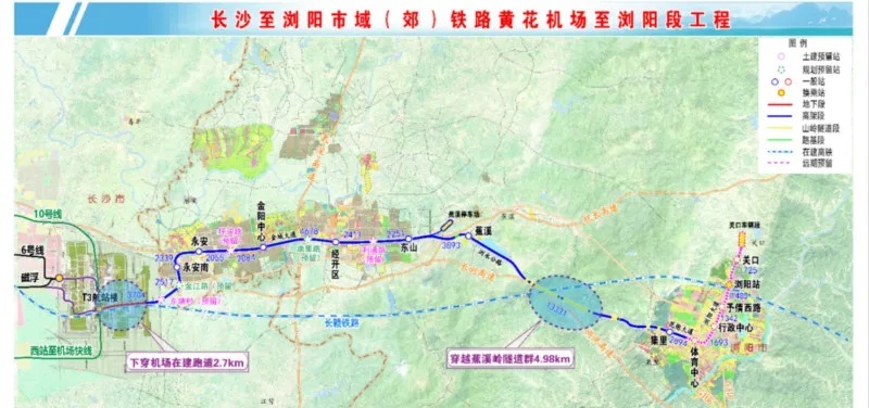 项目采用一次性规划、分段实施。首期建设的黄花机场至集里段,自长沙磁浮东延线终点T3航站楼引出,沿新河南路、金城大道、浏永公路敷设,期间需下穿长沙黄花国际机场在建跑道、上跨杭长及武深高速。首期建设线路长39.52公里,总投资约104.4亿元,新建车站7座,均为高架站,此外土建预留高架站3座、规划预留高架站2座,平均站间距3.95公里,新建蕉溪车辆基地。