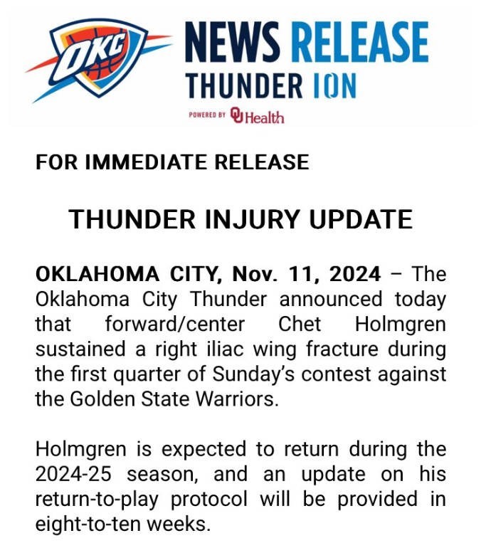 俄克拉荷马城,2024年11月11日——俄克拉荷马城雷霆队今日宣布,前锋/中锋切特-霍姆格伦在今日对阵金州勇士的比赛第一节受伤,诊断为右髂骨翼骨折。