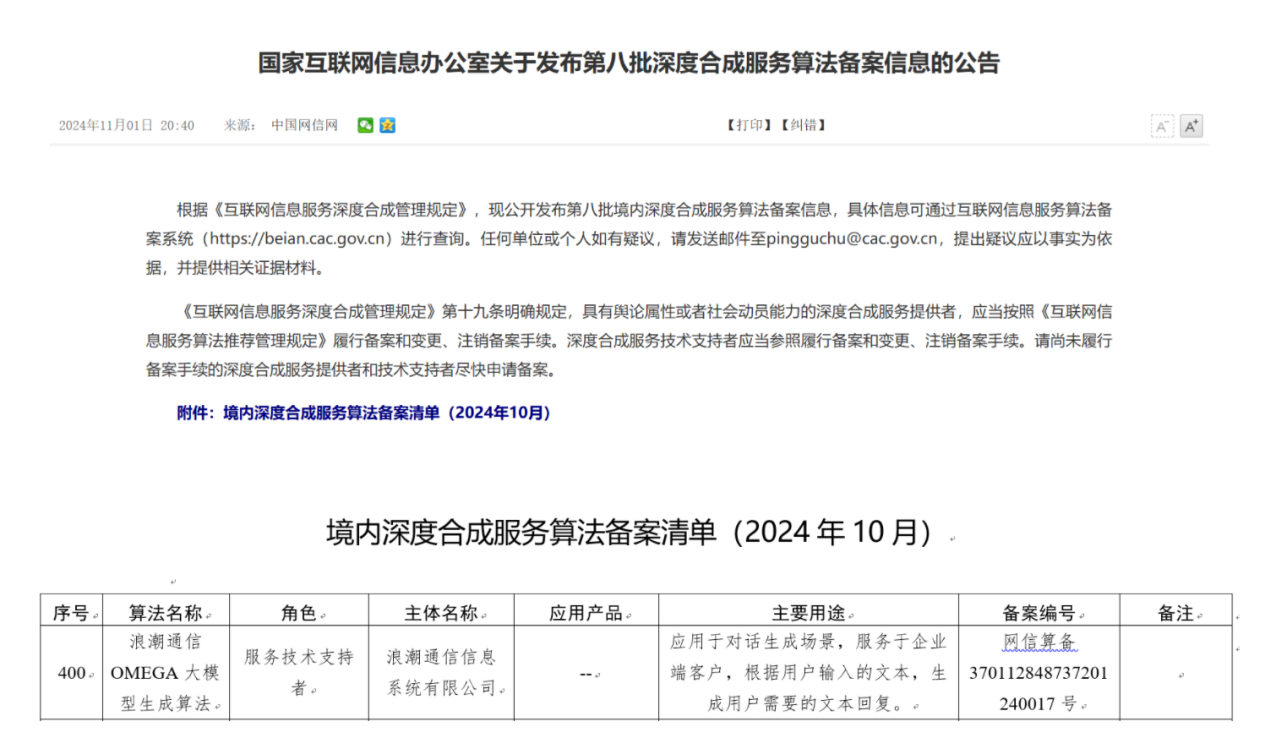 近日,国家互联网信息办公室正式发布第八批深度合成服务算法备案信息,由浪潮通信信息打造的OMEGA通信大模型成功通过算法备案,标志着OMEGA通信大模型在通信领域的AI技术实力获得了国家级权威认可。