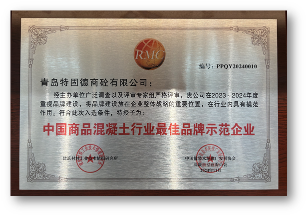 2024年11月9日,青岛特固德商砼有限公司以在品牌建设方面的卓越表现和行业内的模范作用,荣获由建筑材料工业技术情报研究所与中国散装水泥推广发展协会混凝土专业委员会联合颁发的“2023-2024年度中国商品混凝土行业最佳品牌示范企业”称号。