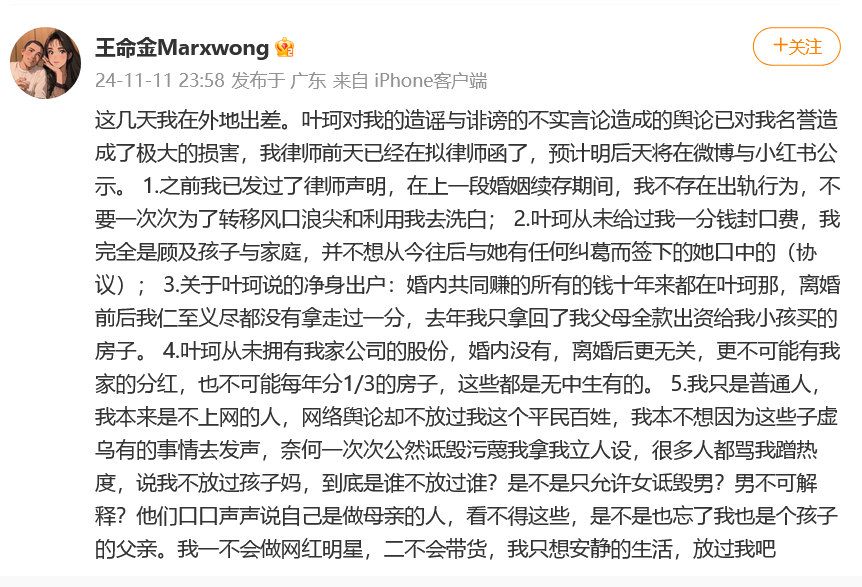 11月11日深夜,叶珂前夫王命金发长文称叶珂对他的造谣与诽谤的不实言论造成的舆论已对其名誉造成了极大的损害,律师已经在拟律师函,预计这两天将公示。