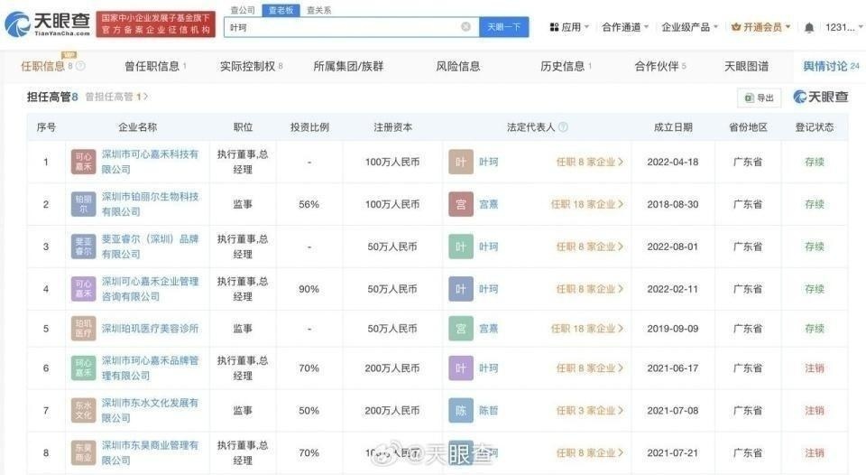 据天眼查消息,叶珂共关联8家企业,其中5家为存续状态,包括深圳市可心嘉禾科技有限公司、斐亚睿尔(深圳)品牌有限公司、深圳可心嘉禾企业管理咨询有限公司等,叶珂在上述公司担任执行董事、总经理等职务。