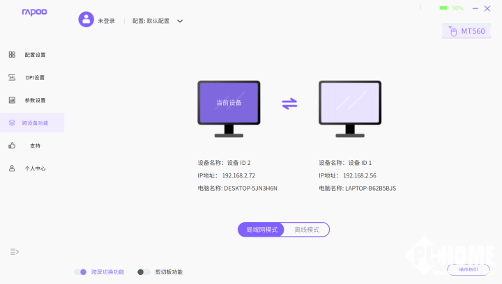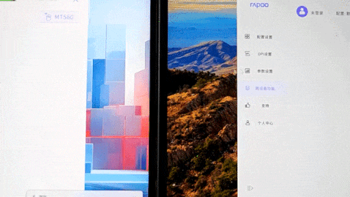 在分别设置好两个接收器与鼠标的连接后,点击跨设备功能,就可以看到鼠标已连接的设备。通过中间的切换按钮,可以根据设备的摆放位置,切换指针移动顺序。雷柏MT560支持离线模式和局域网模式的跨屏操作。离线模式无需在同一网络下,仅需连接两个接收器并下载驱动软件即可实现无线跨屏功能。鼠标移动到屏幕边缘,鼠标会自动切换到另一台设备。