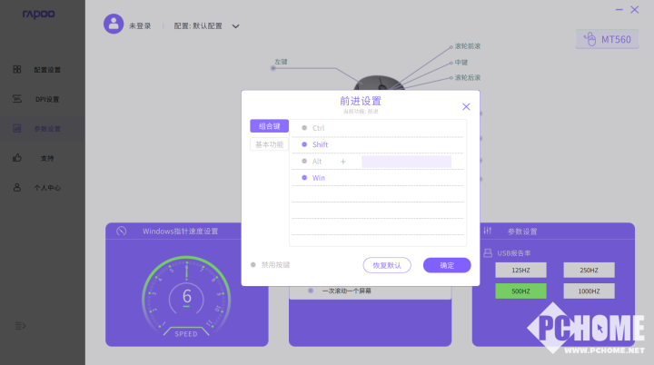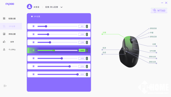 硬件方面,雷柏MT560鼠标采用了原相3220光学引擎,可以在多种材质表面使用,带来更多环境的适配。预设800/1000/1200/1600/2400/3200/4000共计7档DPI值,可以通过DPI按键顺序调节,也可以在驱动内自定义各个档位的数值,满足用户的个性化使用需求。