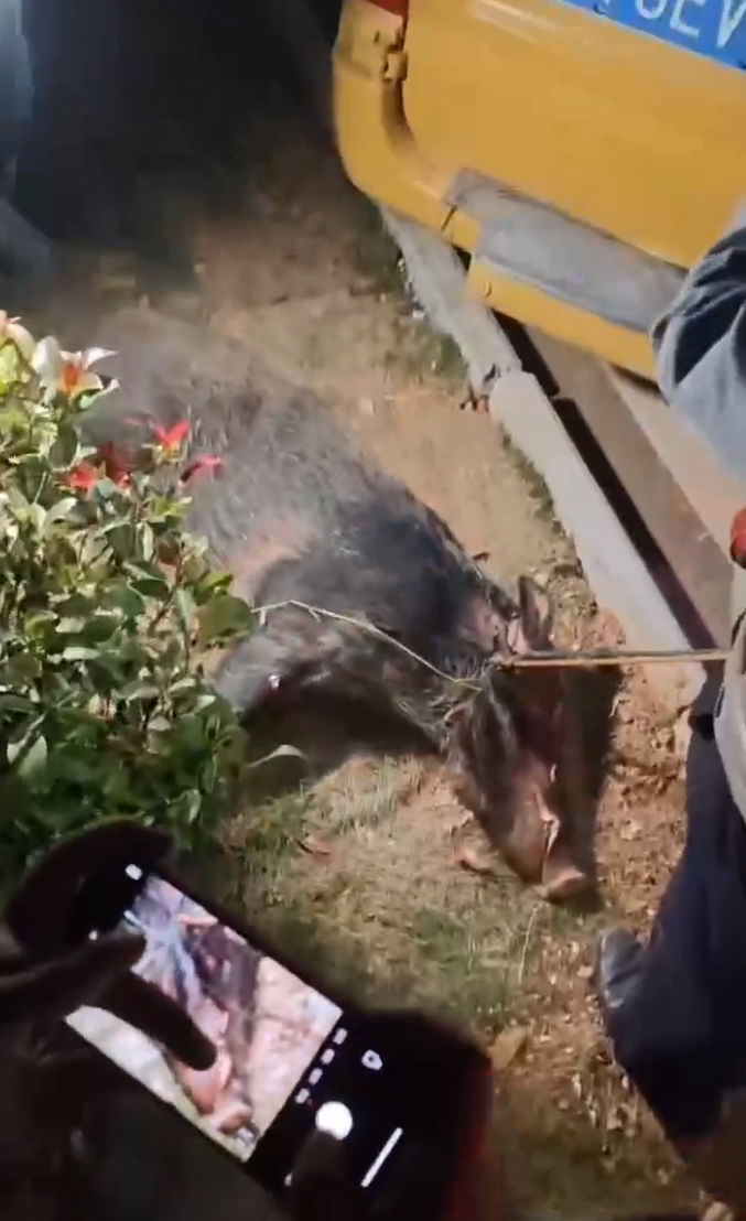 晚上10点左右,经2个小时多的搜寻,狩猎队在学校操场的一处围墙边发现1只野猪,最终成功捕获。