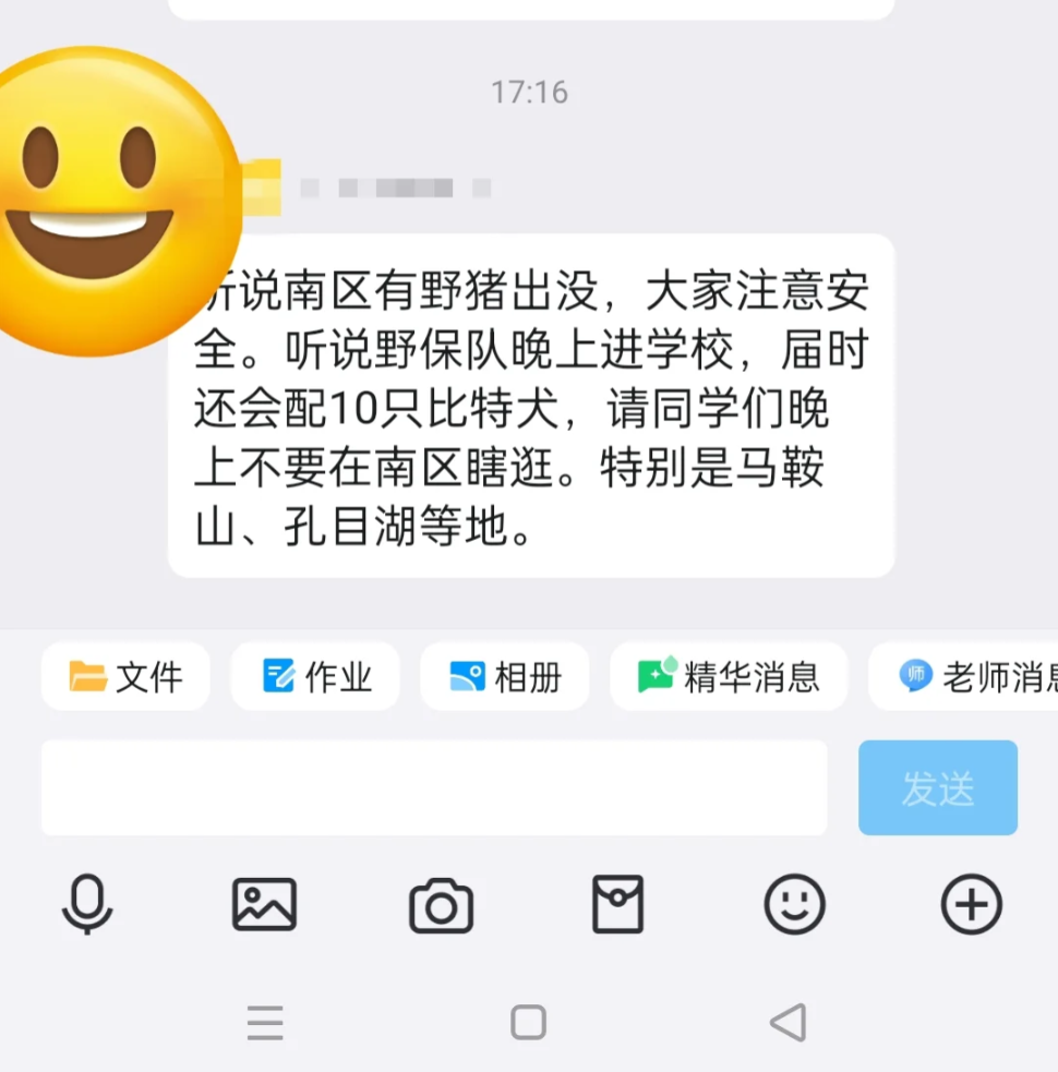 都市现场记者了解到,为了配合狩猎队捕获野猪,华东交大也提前发布通知。其中一则来自华东交大的学生群消息通知显示:“听说南区有野猪出没,大家注意安全。野保队晚上进学校,届时还会配10只比特犬,请同学们晚上不要在南区瞎逛。特别是马鞍山、孔目湖等地。”
