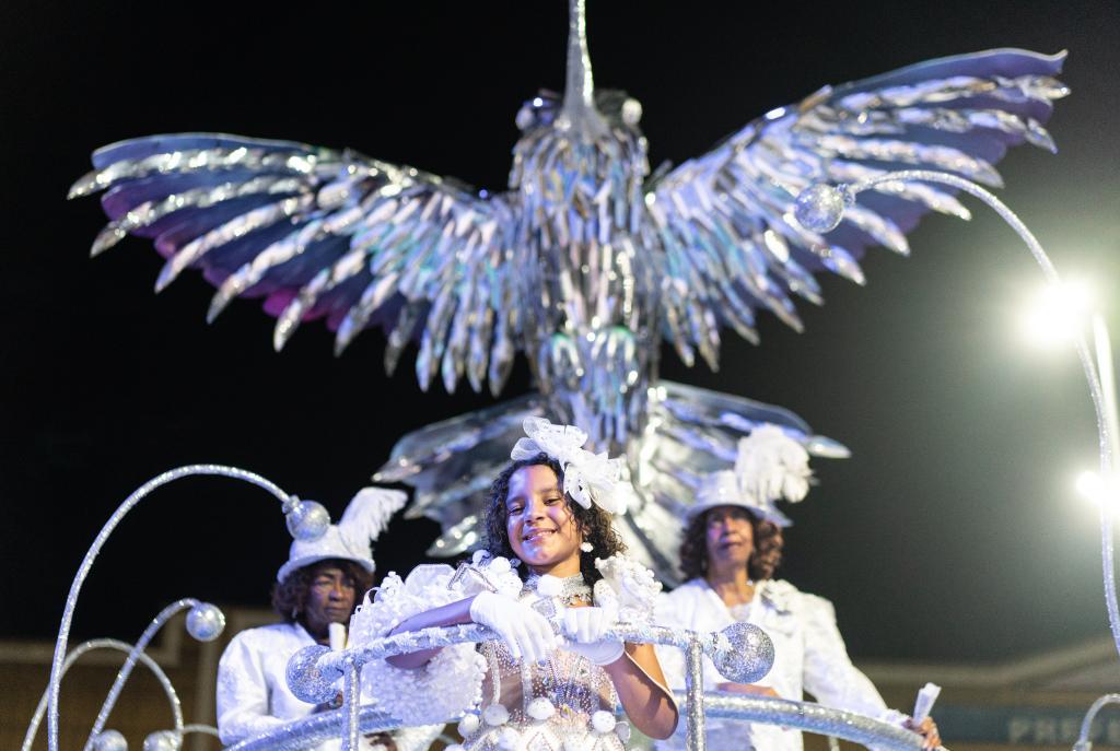2023年12月1日晚,在巴西里约热内卢,来自蜂鸟舞校的演员参加桑巴游行。新华社记者王天聪摄