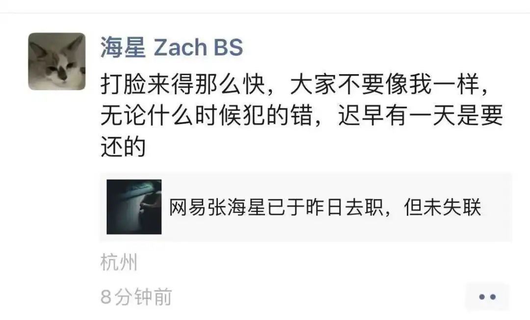 张海星接受了公司调查同时在朋友圈中表示「打脸来得那么快,大家不要像我一样,无论什么时候犯的错,迟早有一天是要还的」。