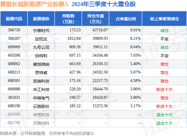 景顺长城新能源产业股票A的前十大重仓股如下: