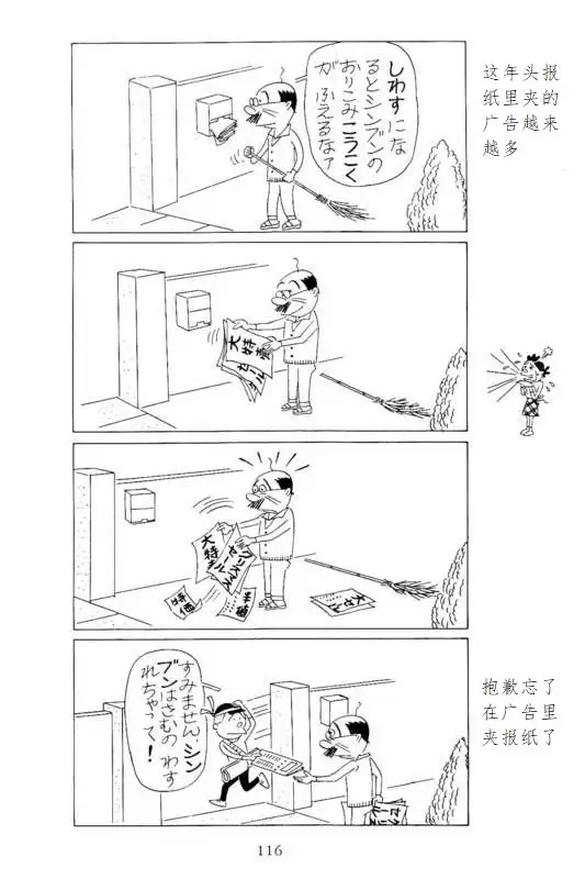 连载多年的《海螺小姐》一方面保持了北泽乐天等战前漫画家确立的四格形式和接近讽刺画的画风,也会随着时代变化对内容进行调整。比如“以父亲为中心,在电灯下低头默默吃饭”的家庭面貌到了1960年代的“高速增长期”发生了相当的变化,出现了全家一起出去郊游,去外头的饭店(还是具有异国情调的中国饭店)就餐的情景。