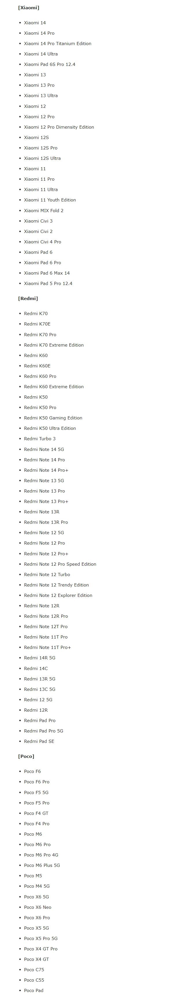 Redmi品牌的适配设备更多,包括K70系列、K60系列和K50系列等,还有Note 14系列和Note 13系列等,Redmi 13和Redmi 12系列以及Redmi Pad SE等也在列;
