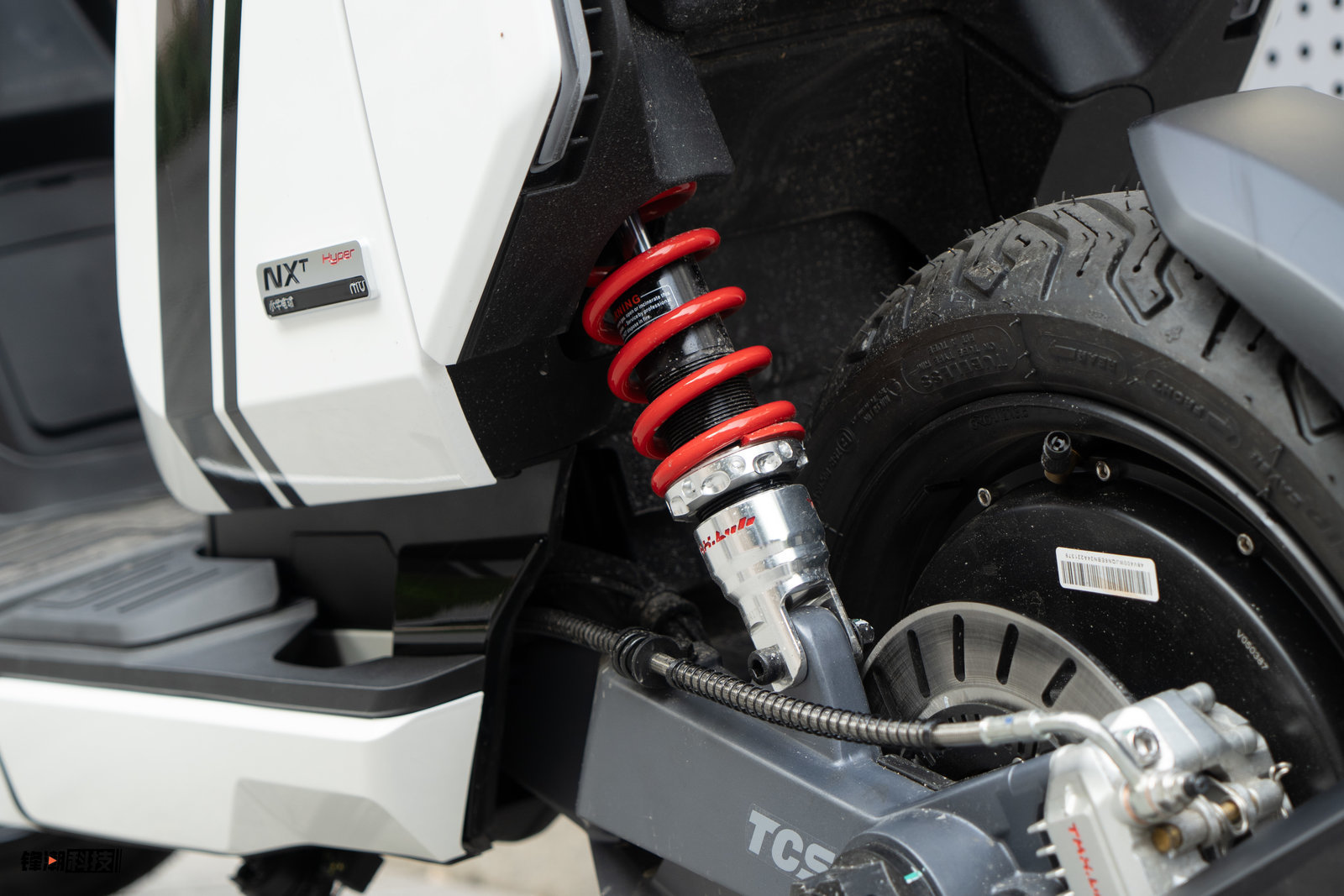 小牛NX Hyper 的前减震采用倒置镀钛减震设计,CNC 工艺配合镀钛工艺有效提升耐磨性和抗腐蚀性,还有氮气的加入,增加减震的阻尼力。前减震拥有高达 35mm 的减震直径,后减震则预载 0-40mm 的无极可调后减震,能使车在颠簸地带时能有更平稳的表现,骑行更舒适。