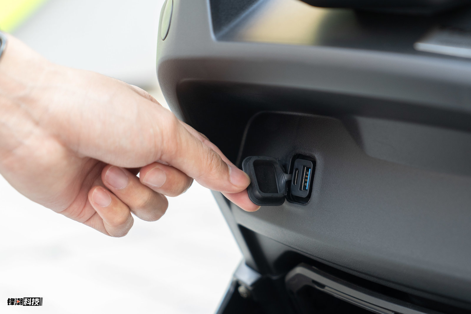在挂钩处上方的左侧有两个快充接口,有一个 A 口和一个 C 口设计,在需要时可以为手机等电子设备供电,还是非常方便的。