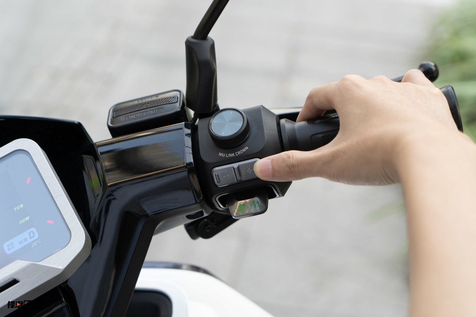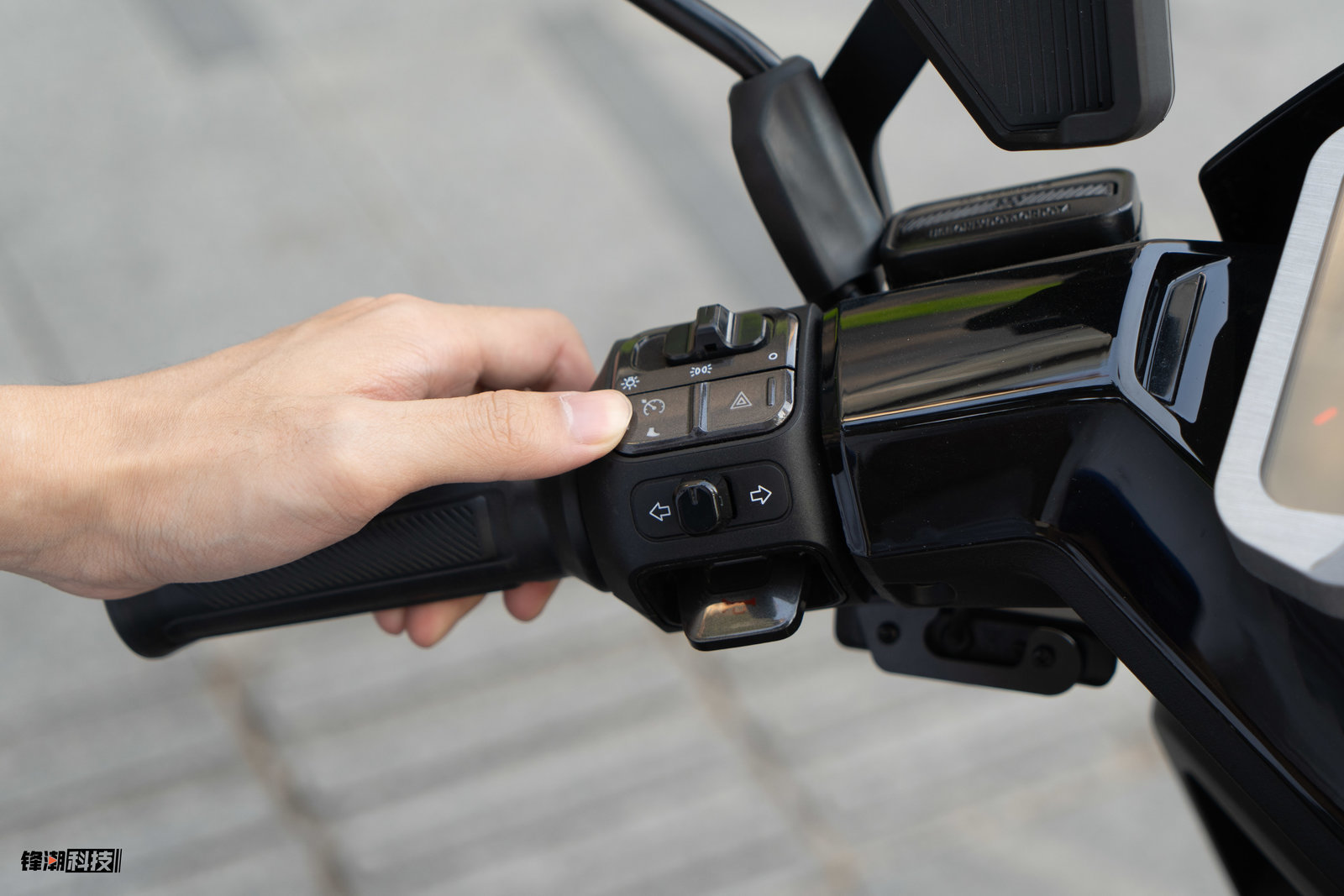 摩托车的握把位置的按键比较简约,每个按钮有什么作用都能很直观地看出来。就像左边的位置,上方是灯光的开关按钮,中间从左到右分别是定速巡航/助力推行按键和双闪按键,下方则是转向灯拨盘和喇叭按钮。
