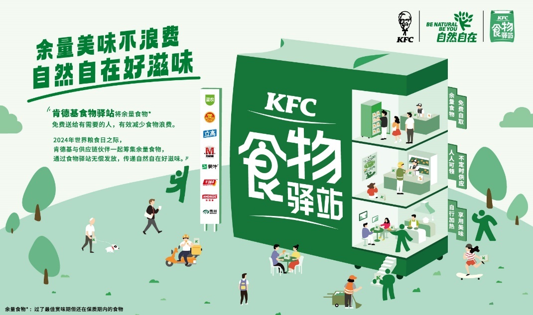 2020年,肯德基品牌以“珍惜粮食、减少浪费”为初衷,结合自身特点,首创餐饮行业“食物驿站”公益模式,将店内的余量食物免费送给有需要的人。所谓“余量食物“,即已过最佳赏味期但仍在保质期内的食物。在肯德基食物驿站,当日产生的余量食物会在收集后统一包装并贴上食用指引,经过冷冻后,不定时、不定量免费发放,供有需要的人按需领取。其主要受众群体覆盖环卫工人、外卖小哥,及餐厅周边居民。所领取的食物为非即食食品,领取者需自行加热烧熟并于当天食用,且只可复热一次。在保障食品安全的前提下,此举既能向社会弱势群体传递温暖、提升其生活品质,也有助于向全社会普及“余量美味不浪费”的理念,是对肯德基公益“自然自在”可持续理念的践行。